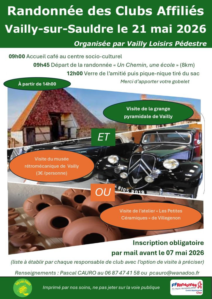 par Vailly Loisirs Pédestre le jeudi 21 mai 2026 à Vailly‑sur‑Sauldre.